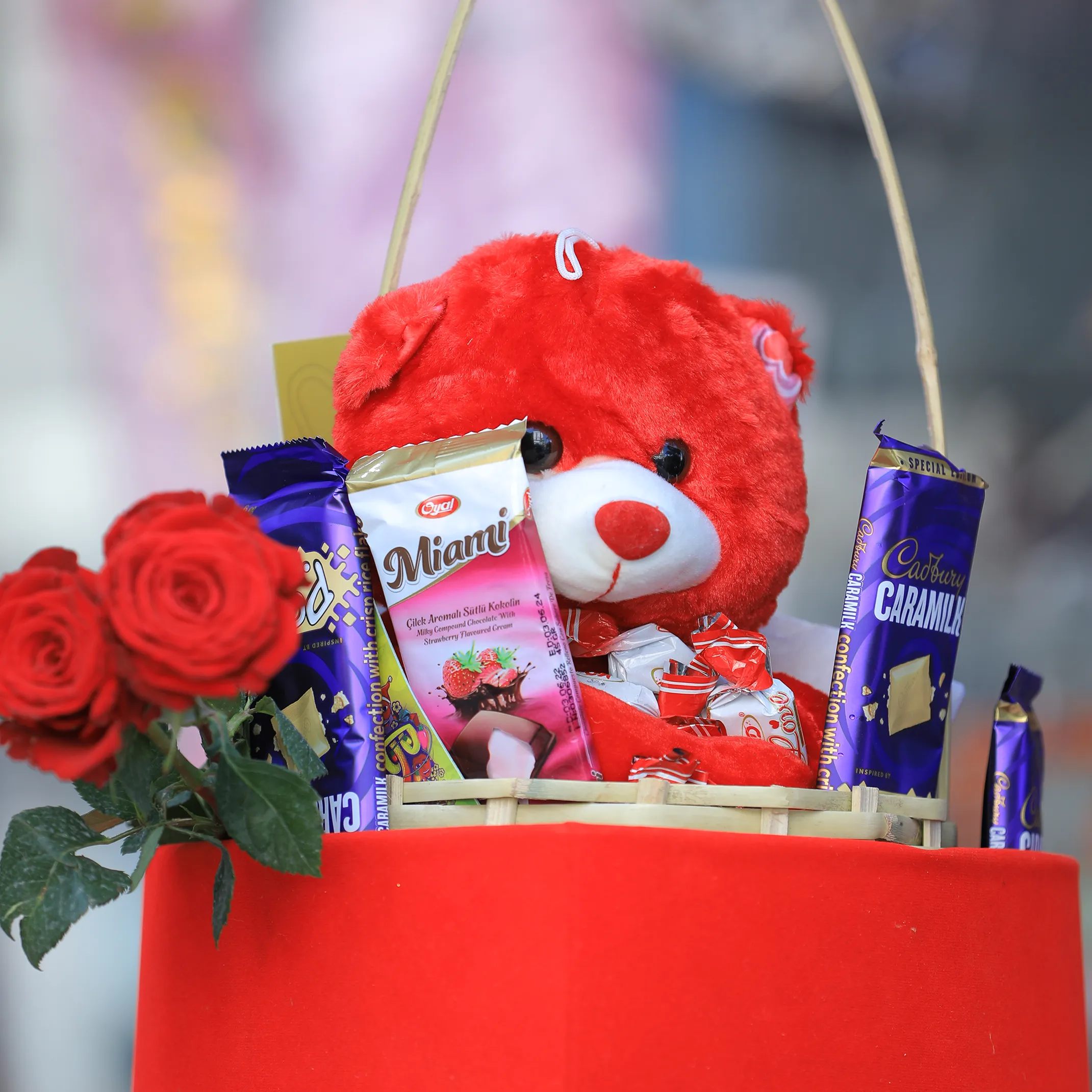 30 cm Teddy bear, 3 Bars Chocolate, a Pack of Candy with greeting card, and a Bouquet of Flower.